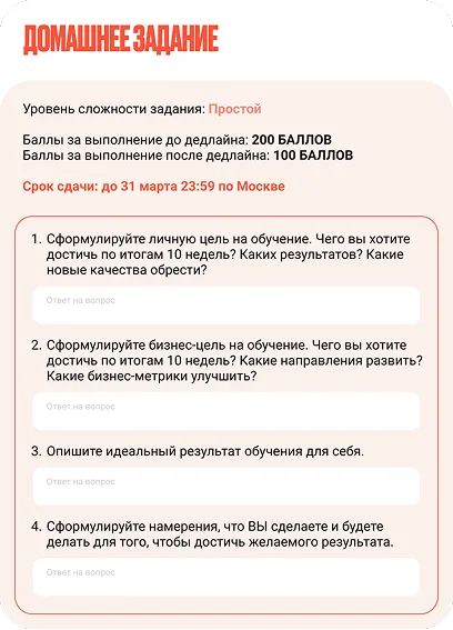 К каждому домашнему заданию предусмотрен дедлайн (в основном — 1 неделя с даты открытия модуля). Чтобы получить максимум баллов за выполнение задания, нужно сдать задание ДО дедлайна. Однако если вы сдаете задание после дедлайна, но в рамках общей продолжительности курса, оно тоже будет проверено, но балл уменьшится в 2 раза.