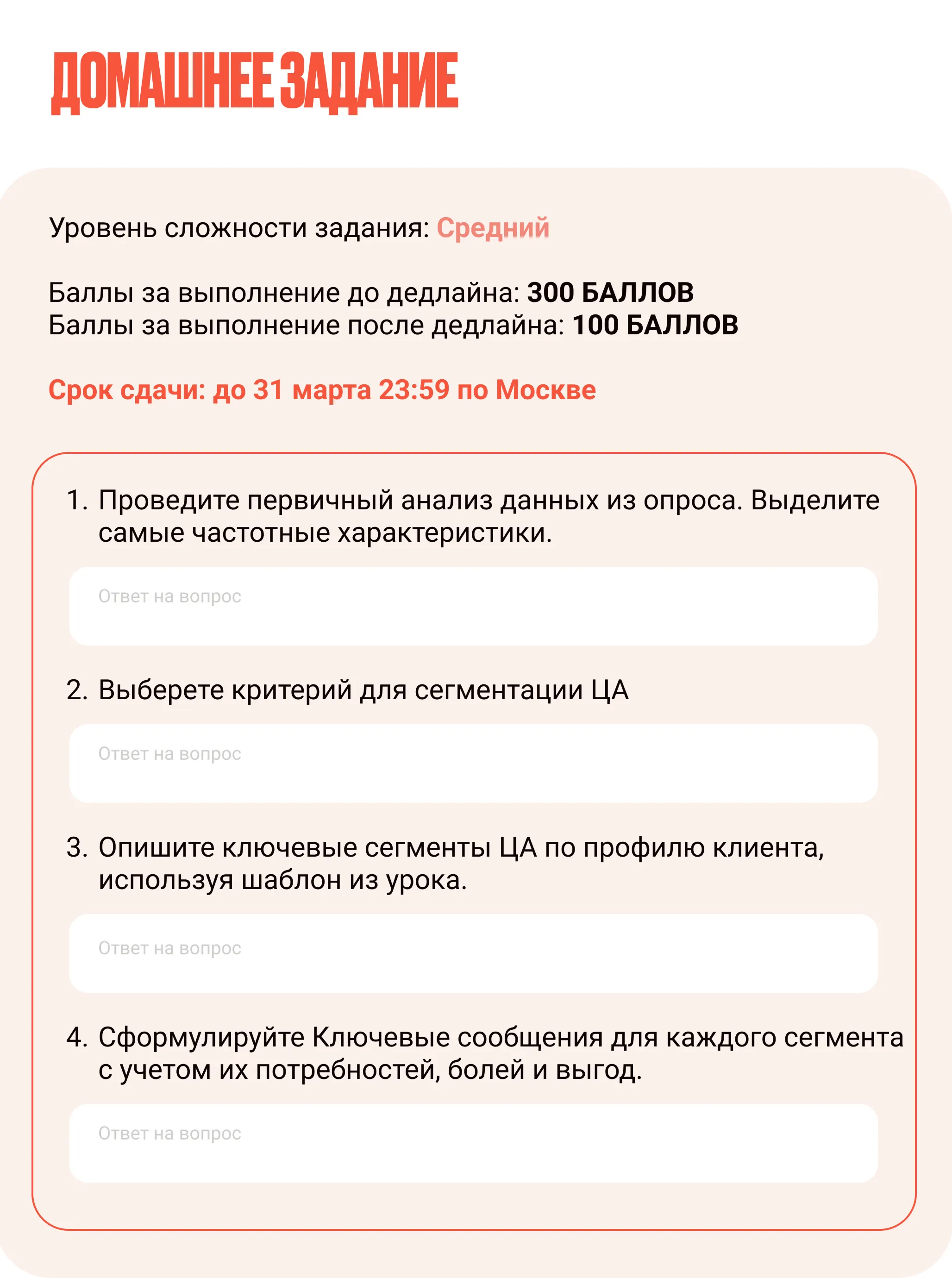 Домашние задания, которые основаны на реальных бизнес кейсах. Только то, что поможет вам запустить новый бизнес или кратно вырастить уже существующий. Для каждого задания созданы шаблоны, фреймворки, чек-листы.